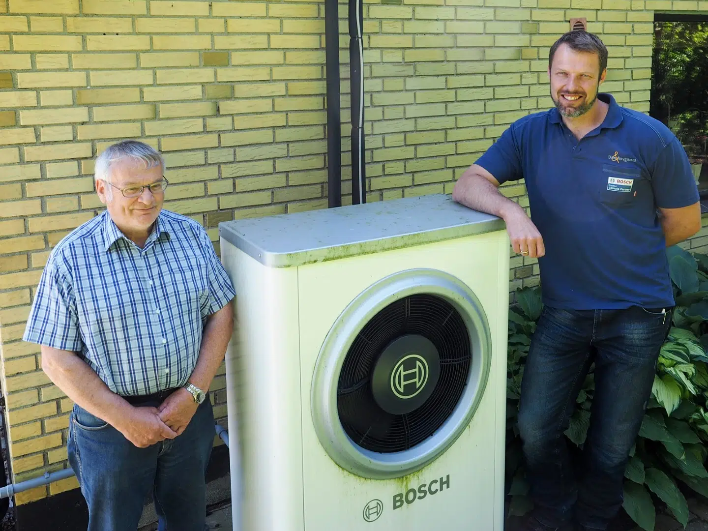 Jens Hovgaard forslog i stedet at erstatte oliefyret med en varmepumpe fra firmaet Bosch, som netop stod foran at sende en ny model på markedet. Den yder op til 9 kW varme, og ægteparret i Breum var blandt de første i Jylland, der fik den installeret.